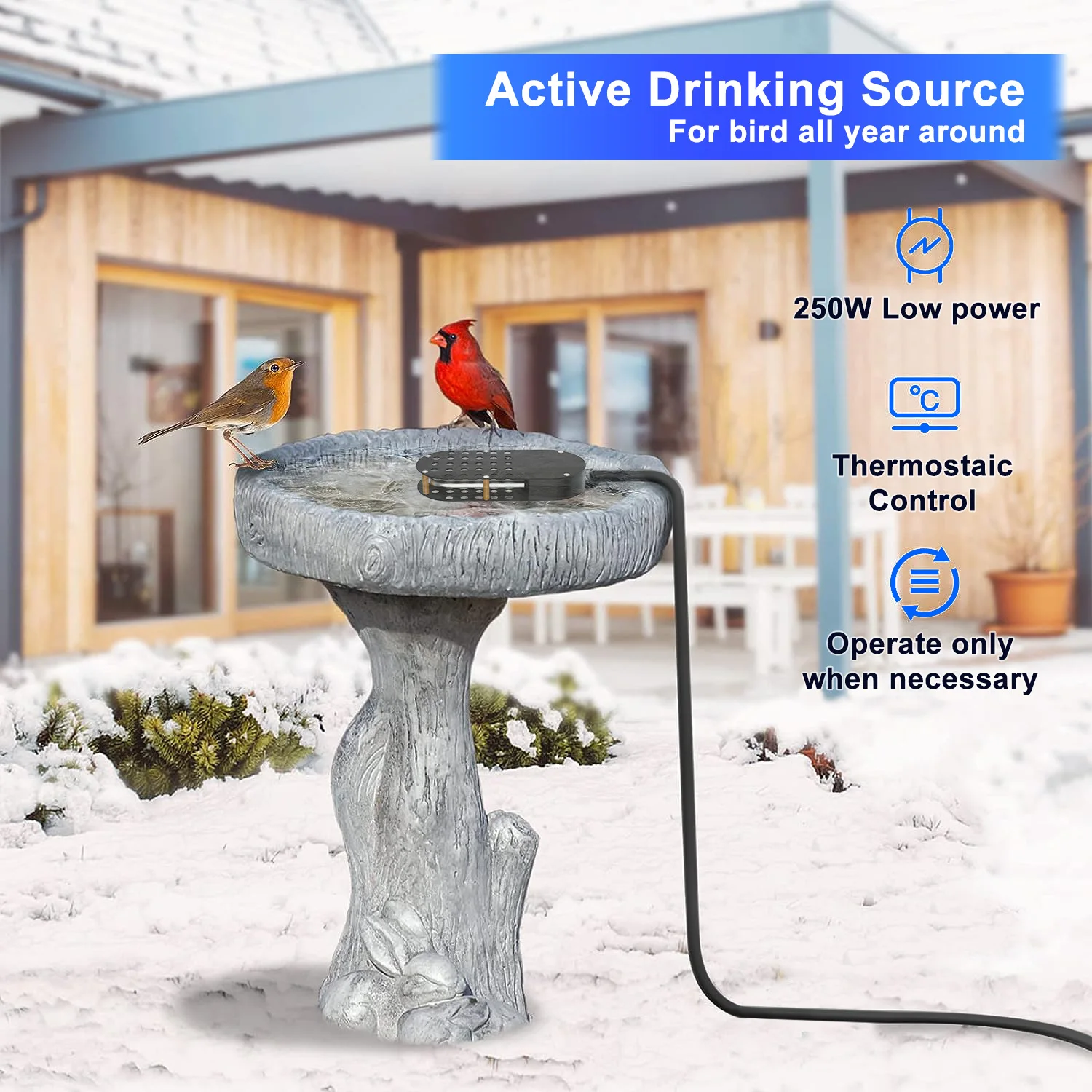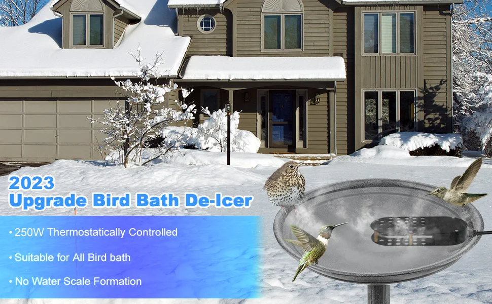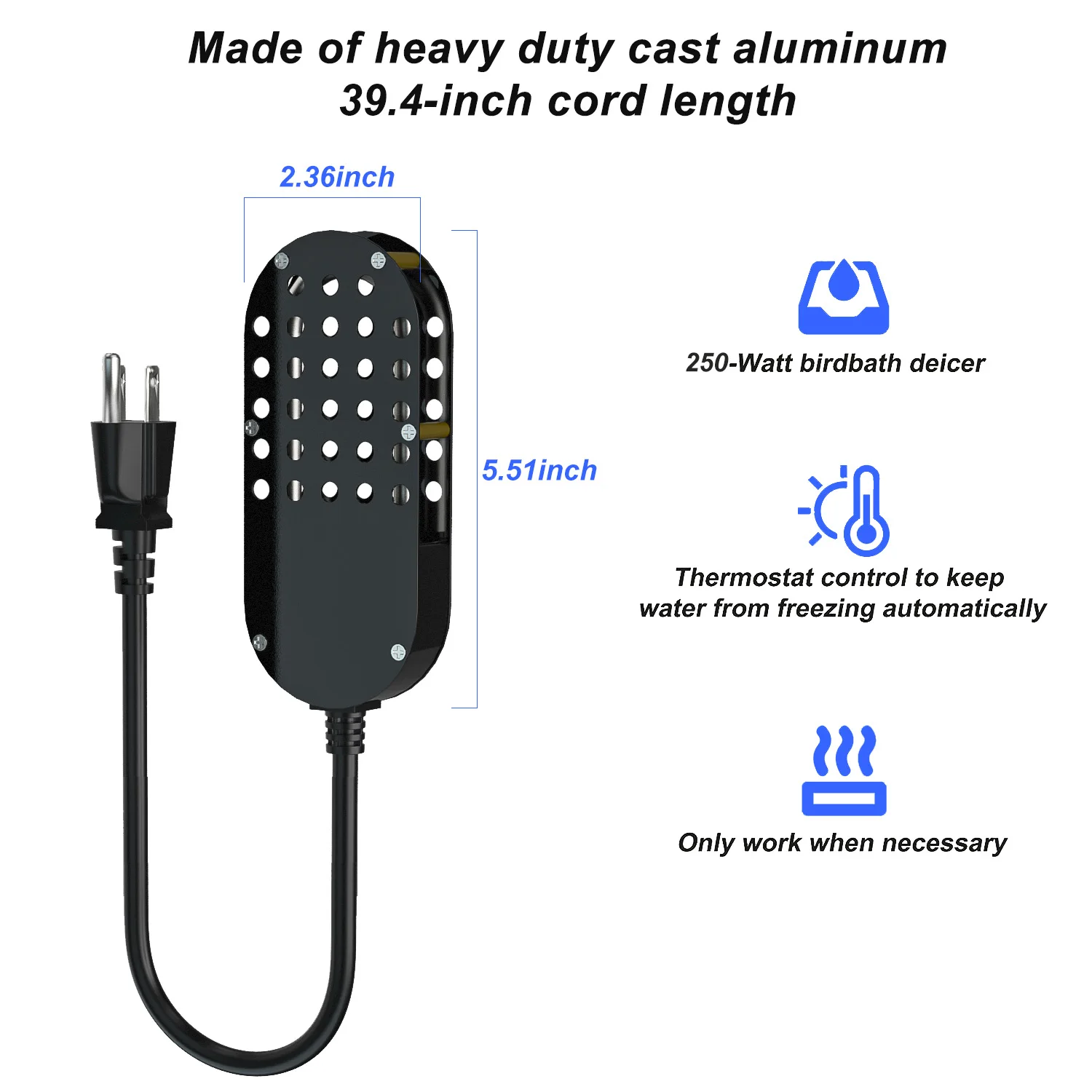 FUNCTION: 250W, 120V bird bath de-icer with thermostat. This birdbath heater will keep the standard birdbath from freezing in winter, thermostatically controlled to operate only when necessary, will not heat up the water! Low power can ensure safe use and save electricity.