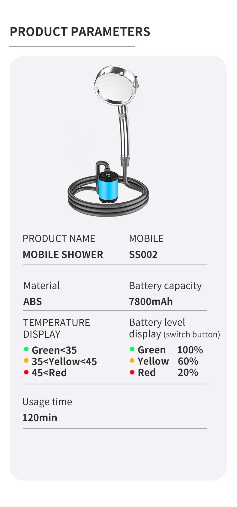 【SALIENT FEATURES】This portable camping shower boasts salient features including long lasting rechargeable 7800mAh battery with port for charging through mobile USB charger, power bank, laptop, etc. to continuously work for 120 minutes. Intelligent LED display for power status and water temperature, adjustable water head, water flow rate of 6.5L/min.