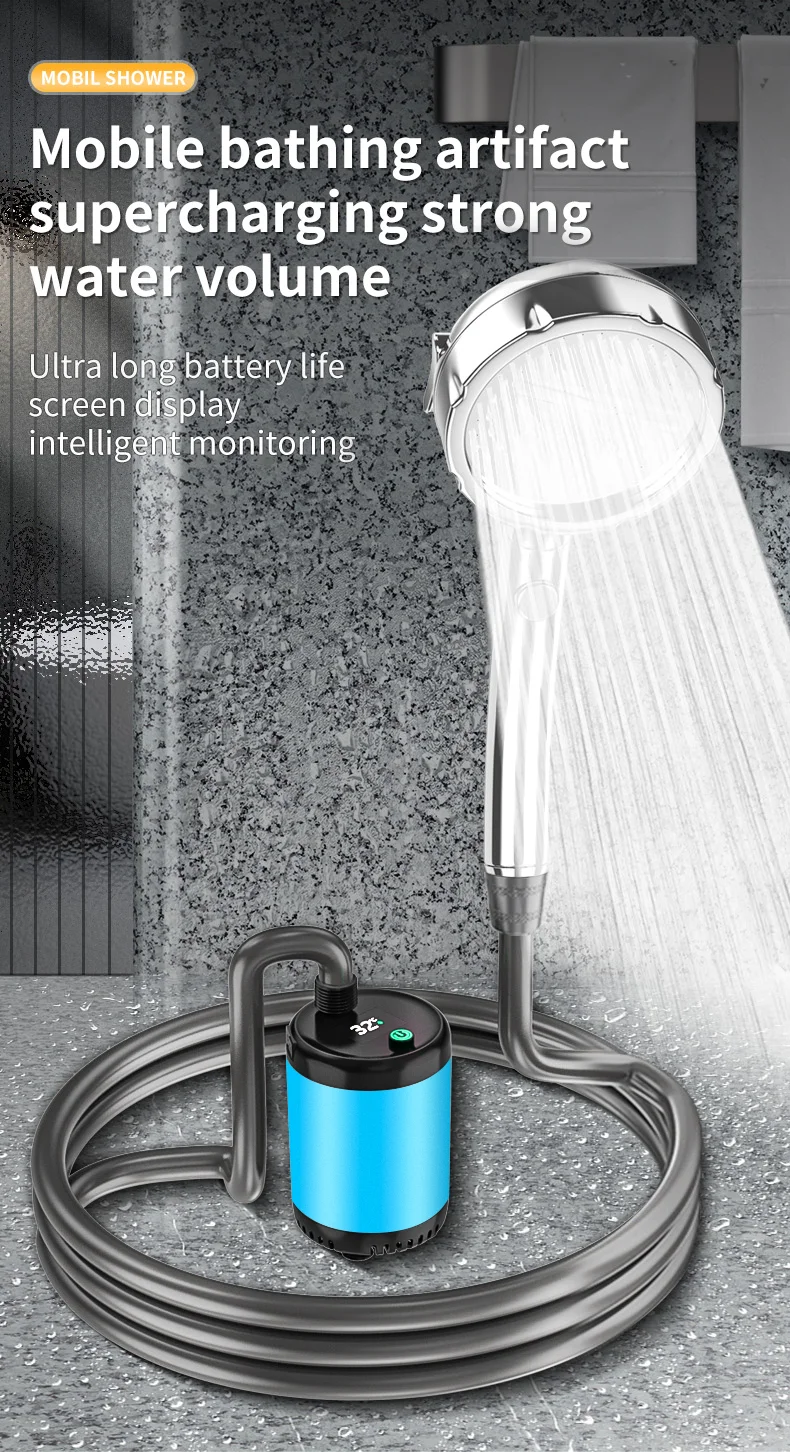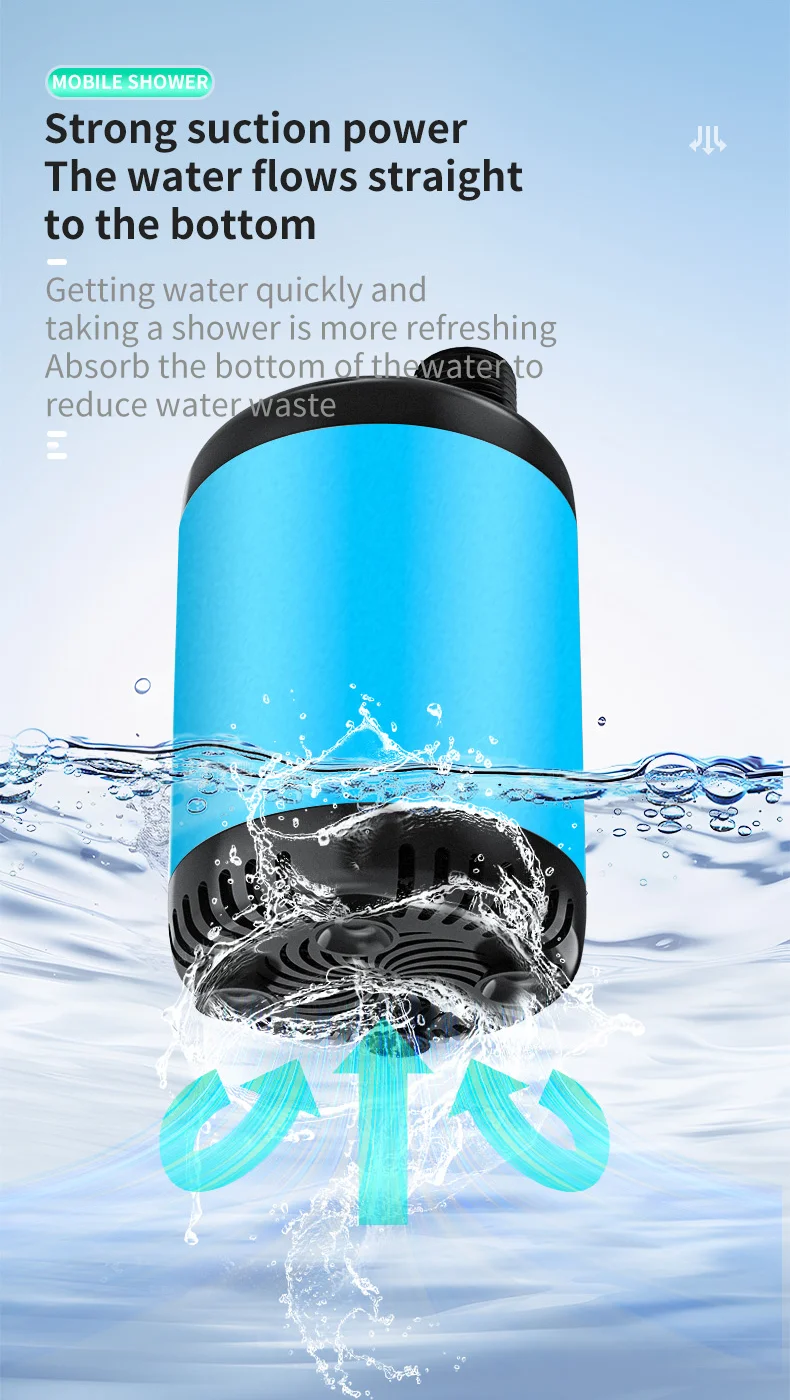 【ALL-IN-ONE SHOWER FOR CAMPING】The lightweight and portable water shower is all-in-one portable heated shower includes 1 pocket-sized water pump powered through a rechargeable battery, a 120V immersion heater, shower head, water hose, 3-in-1 multipurpose suction cup hook, charging cable, mesh storage bag for easy transportation and an instruction manual. Just fill a bucket with clean water, put the shower pump in the bucket and enjoy the best outdoor portable shower experience with your family.