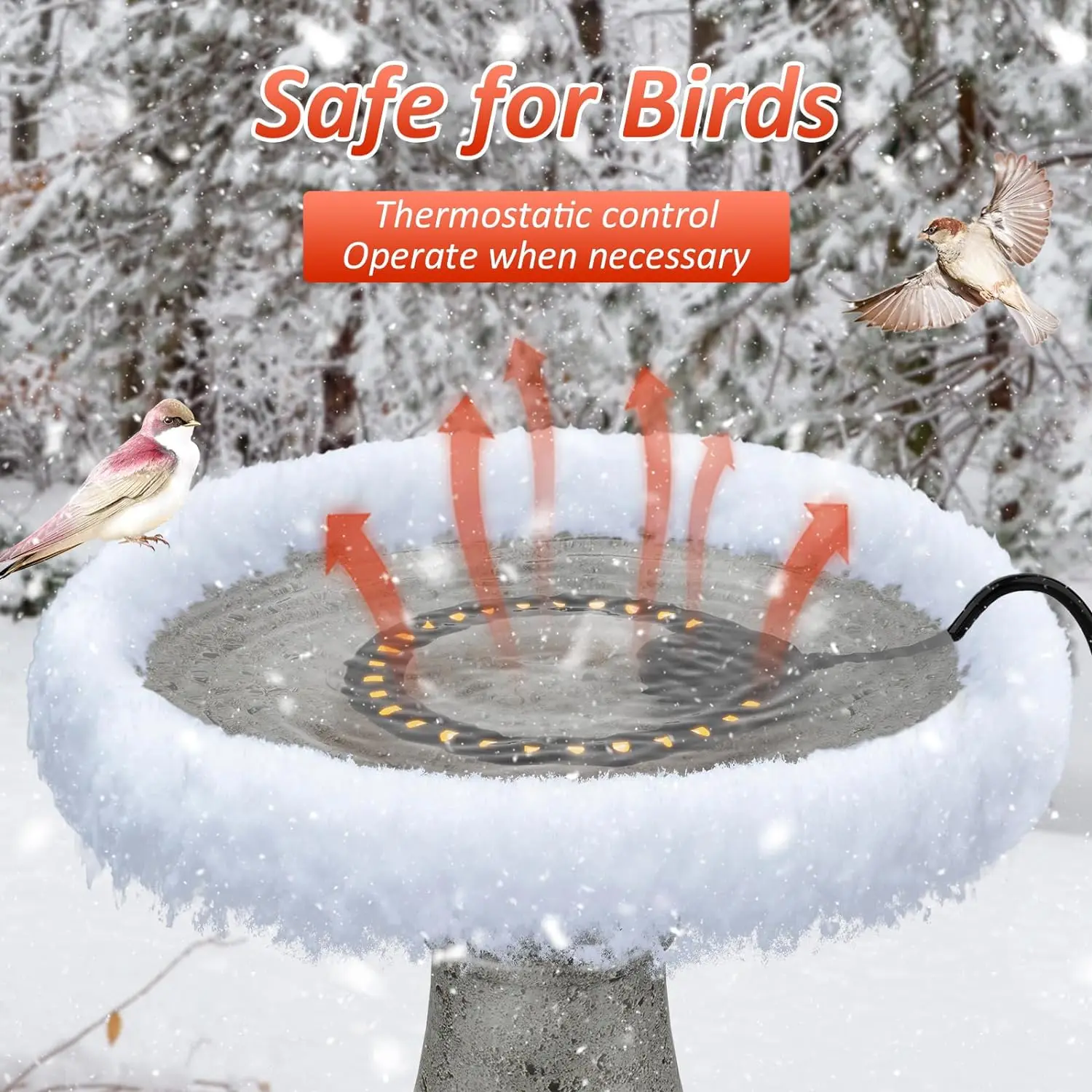 FUNCTION: 250W, 120V bird bath de-icer with thermostat. This birdbath heater will keep the standard birdbath from freezing in winter, thermostatically controlled to operate only when necessary, will not heat up the water! Low power can ensure safe use and save electricity.