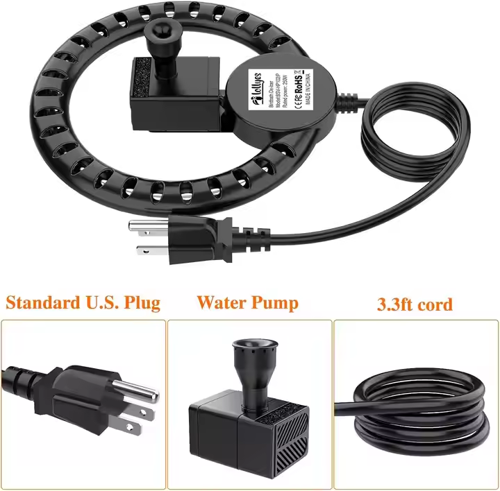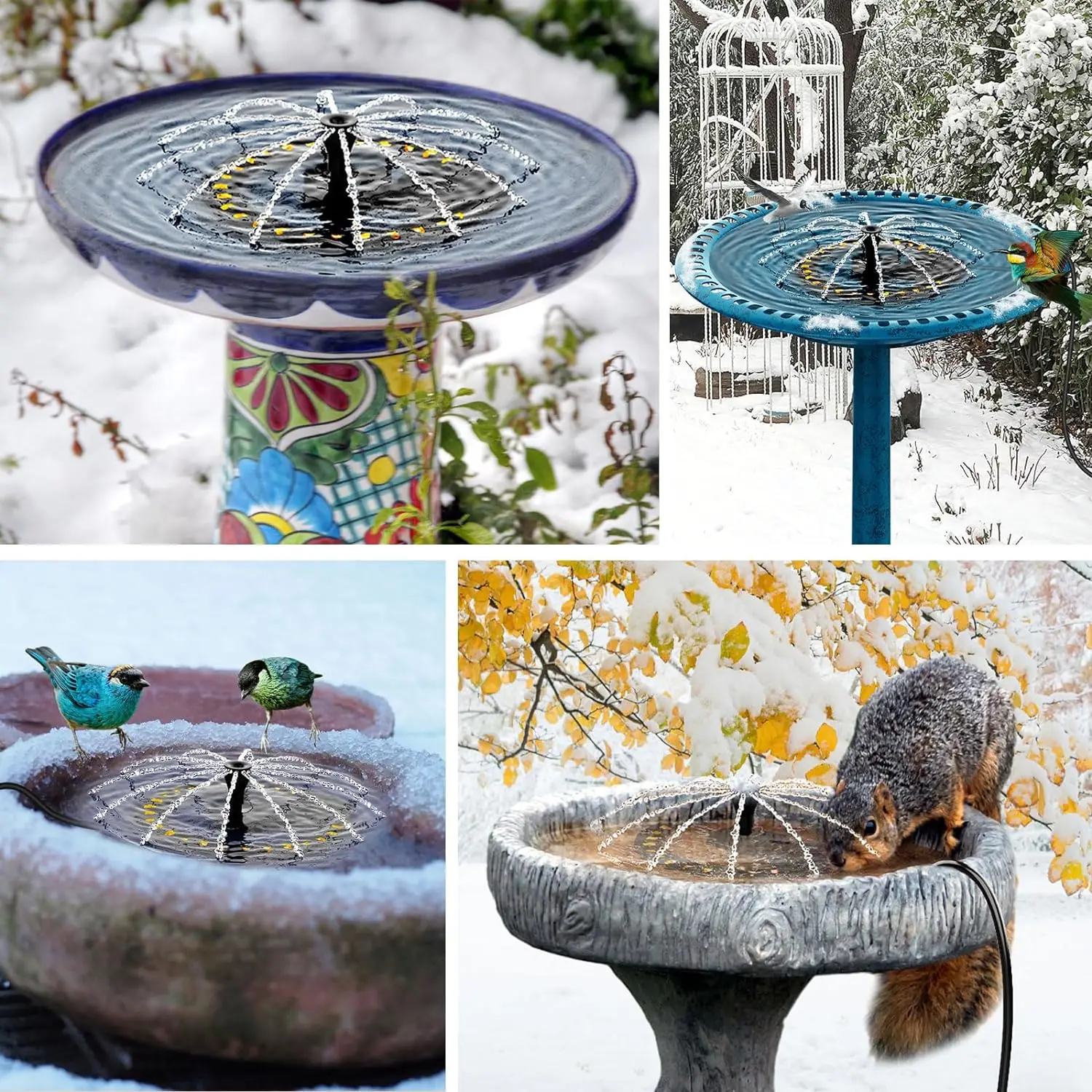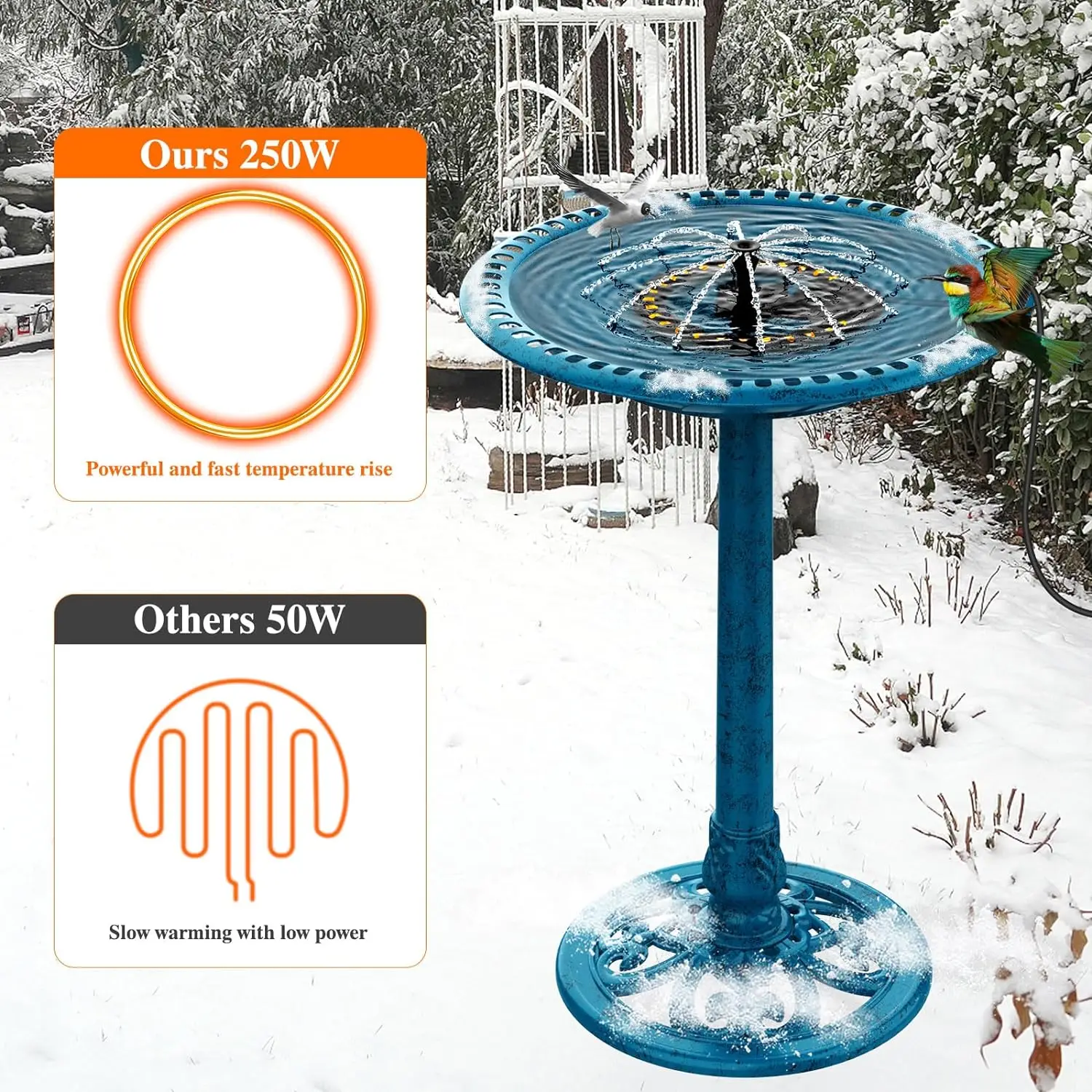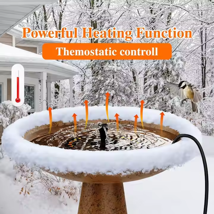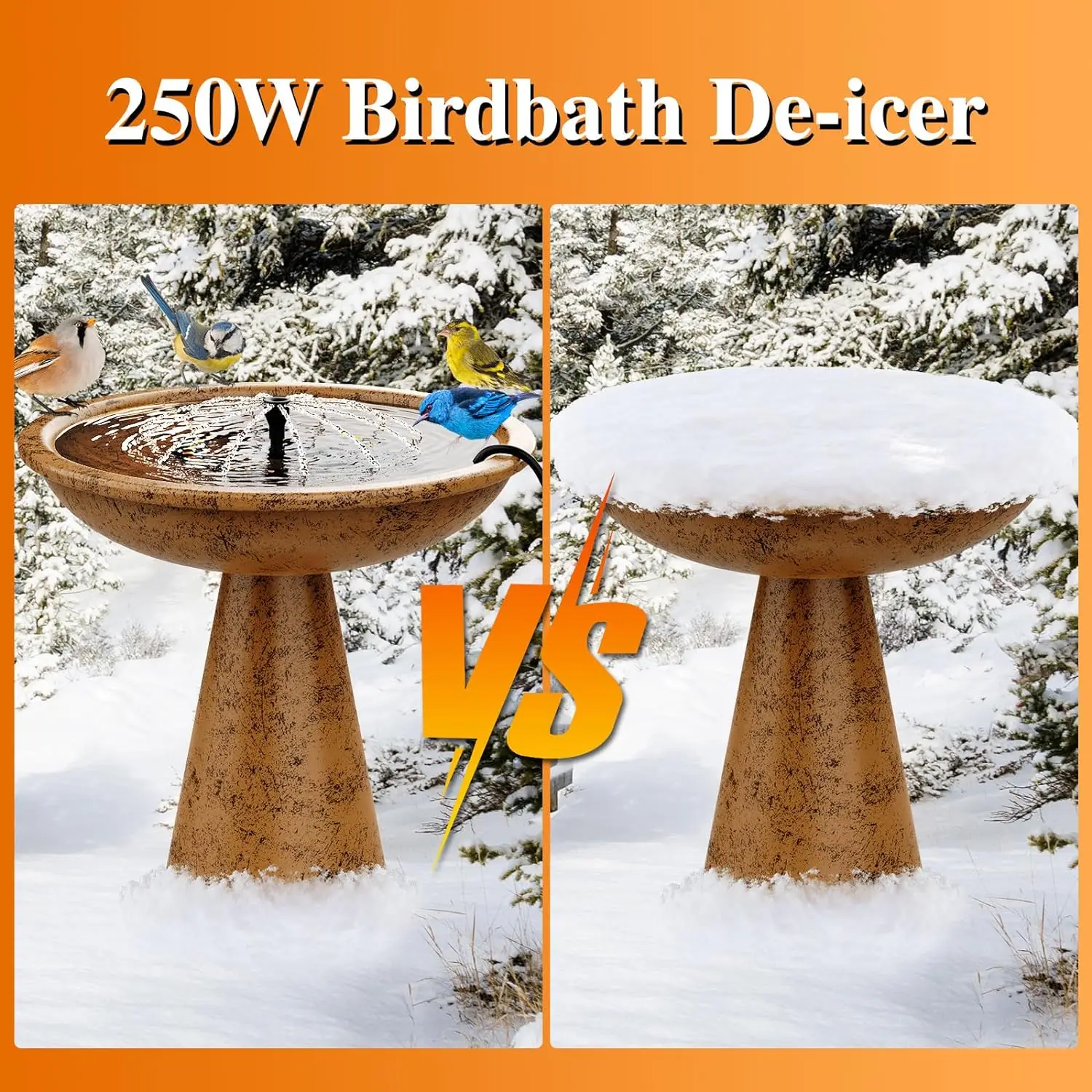 FUNCTION: 250W, 120V bird bath de-icer with thermostat. This birdbath heater will keep the standard birdbath from freezing in winter, thermostatically controlled to operate only when necessary, will not heat up the water! Low power can ensure safe use and save electricity.
