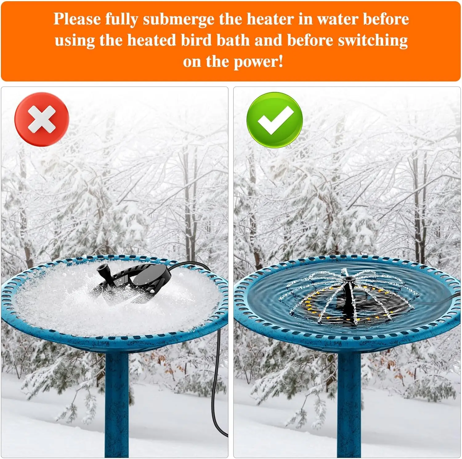 EASY TO USE: Just place the birdbath heater in the center of your birdbath, make sure the heater is full covered by water and plug in, it will start to work. The deicer heater is heavy enough that will not drop out of the bird bath.