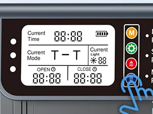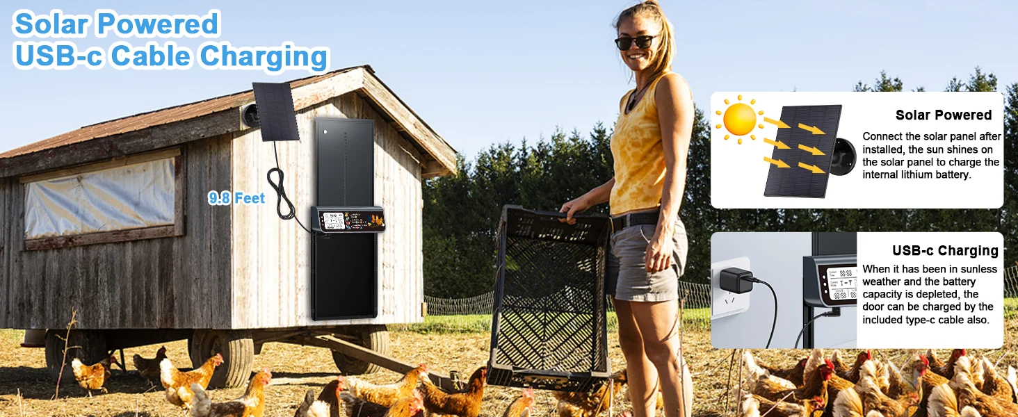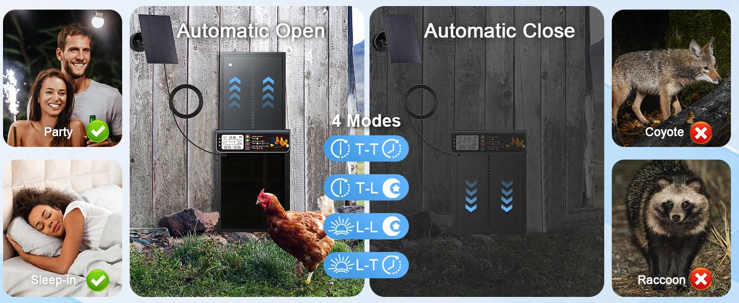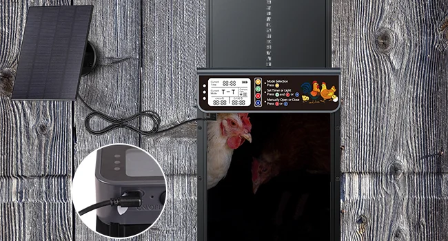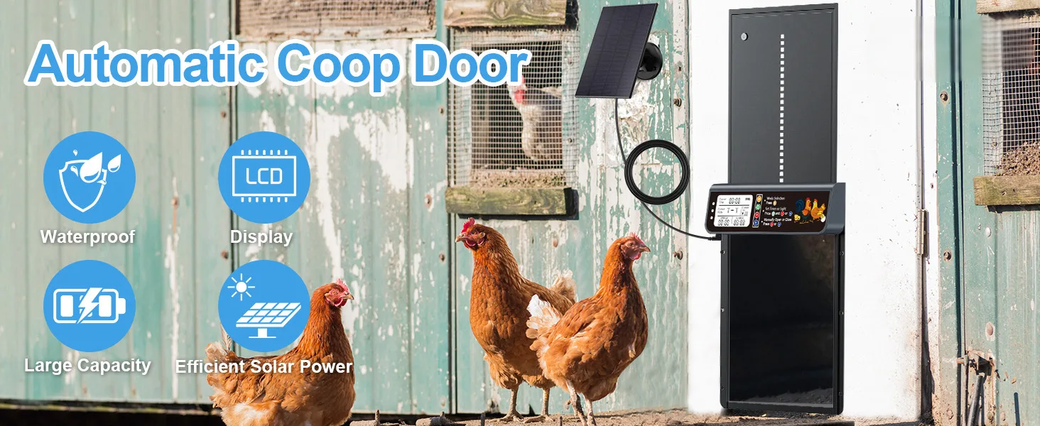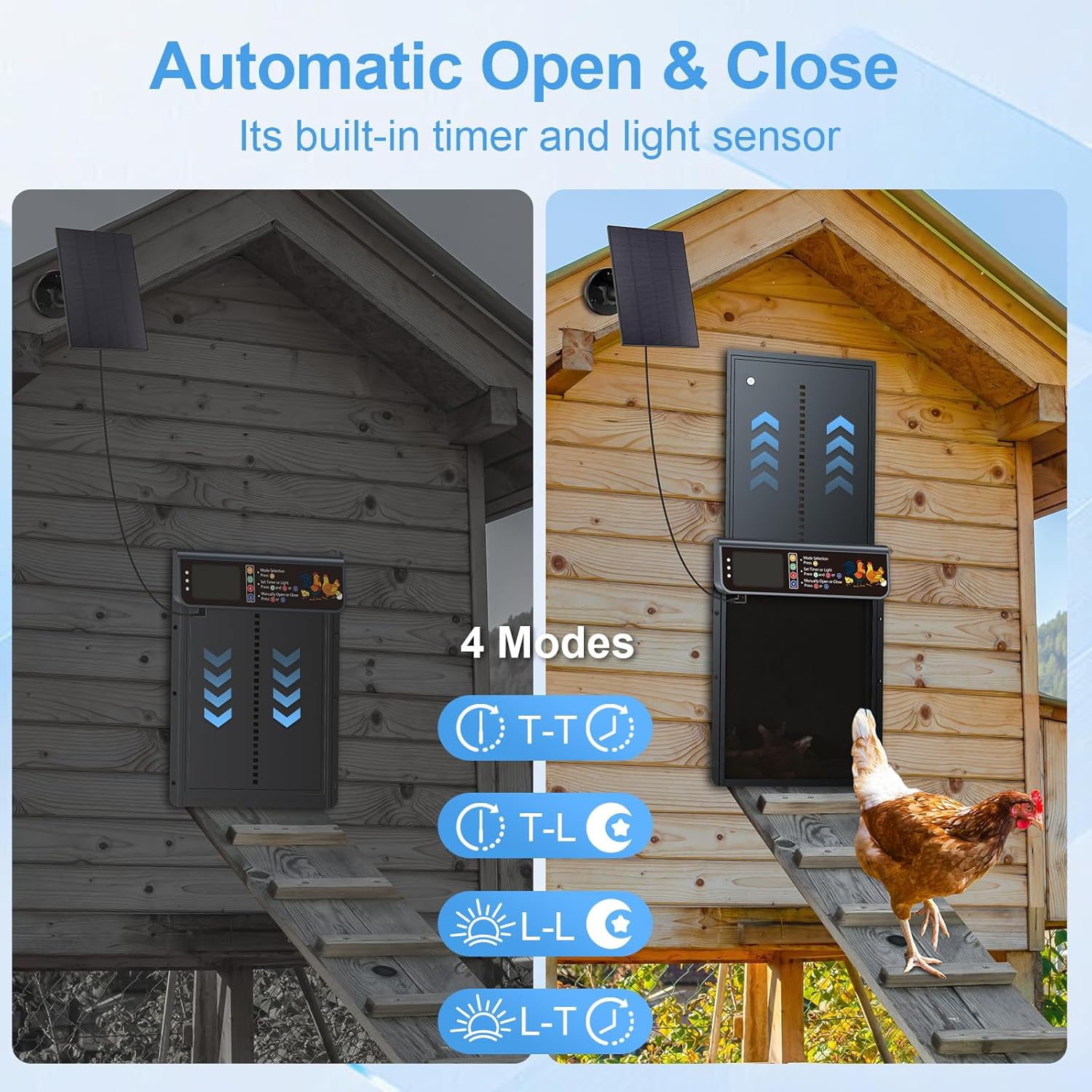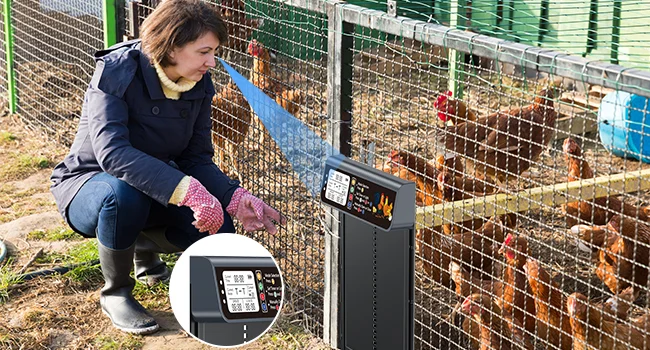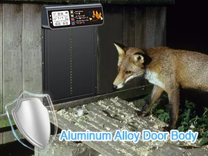 Chicken guard automatic door operating panel designed to tilt upwards, extra bright large LCD screen makes programming a breeze,